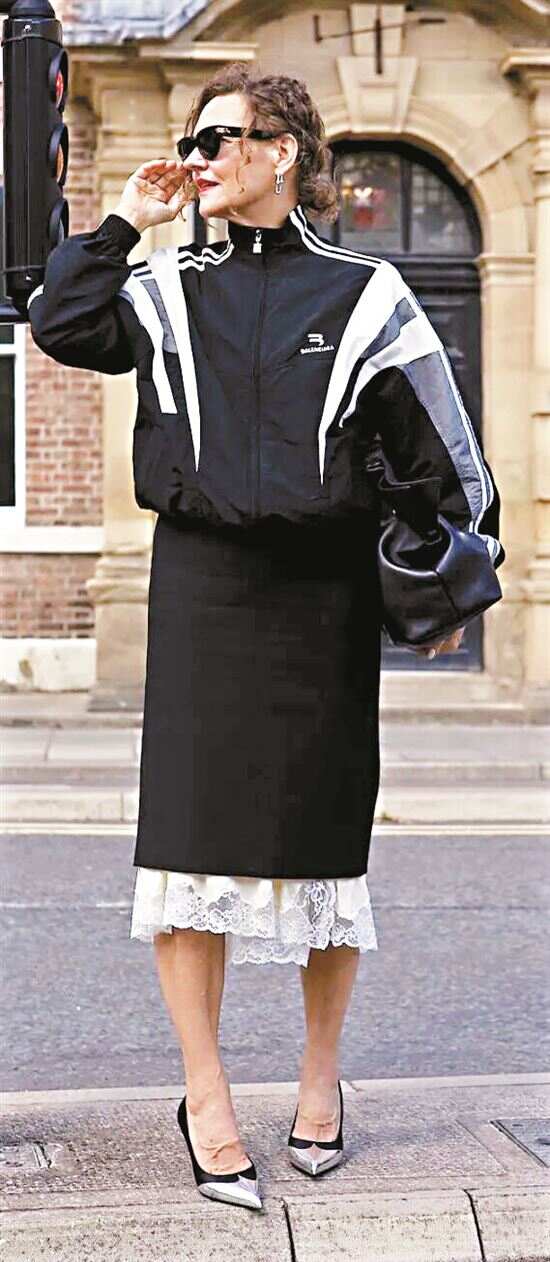 运动夹克的流动线条与铅笔中裙的干净线条相互中和,搭出当下流行的精致休闲风。 |