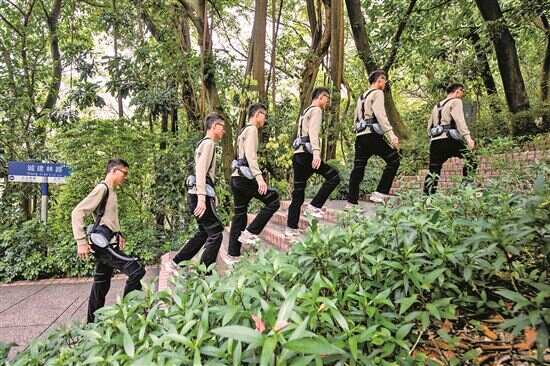 ■游客穿戴着外骨骼机器人在白云山的阶梯上行走。(多帧合成) |