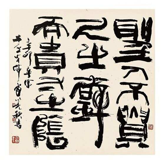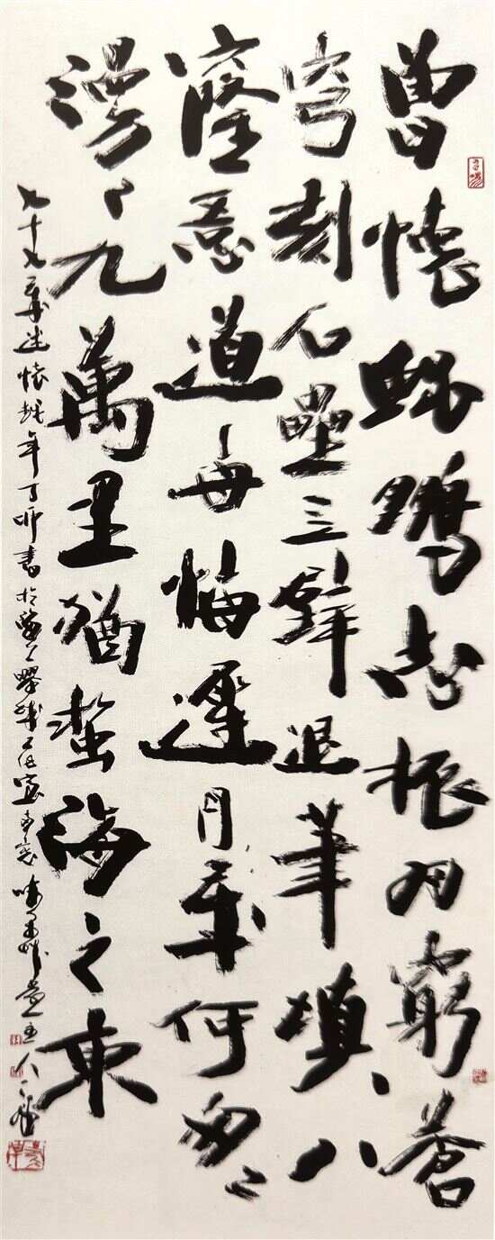 ■韩天衡,自作《述怀》 释文:曾怀鲲鹏志,振羽穷苍穹。刻石垒四壁,退笔填八窿。悟道每悔迟,月岁何匆匆。漫漫九万里,犹蛰海之东。七十七岁述怀,越年丁酉书于海上疁城工作室南窗,味闲草堂主人天衡。 |