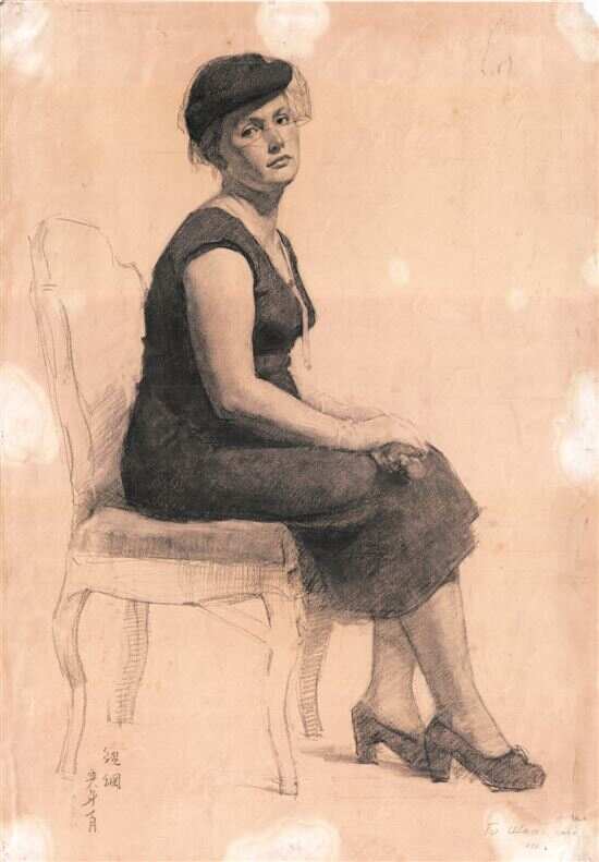 ■《穿黑裙戴黑帽面纱的女人》,1958年,纸本素描,广州美术学院美术馆藏。 |