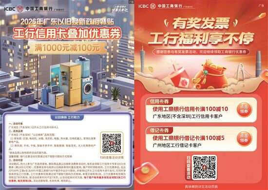 为深入落实政府提振消费战略部署,中国工商银行广州分行(以下简称“广州工行”)主动担当国有大行责任,深度参与“食在广州”“以旧换新”“有奖发票”三大惠民活动,以“政策+金融+场景”组合拳打通惠民利民“最后一公里”,为千年商都消费市场注入强劲金融动能,助力释放内需潜力、激发市场活力。 ●助力“食在广州” 打造羊城美食消费新生态 “食在广州”不仅是羊城的金字招牌,更是拉动大众日常消费的重要引擎。广州工行精准捕捉“老广”对美食的热爱,积极配合政府“食在广州”餐饮消费券活动,持续优化餐饮消费优惠场景,以“消费达标再赠券”的活动机制,拉动二次消费;同时,整合工行侧、银联侧和商户端三大宣传渠道资源,通过微信公众号、朋友圈广告、门店宣传等方式,在每个发券周期定时推送优惠资讯,全方位触达消费者。消费者在享受政府补贴基础上,可领取广州工行额外提供的优惠券,享受政策红利与金融让利的双重优惠,实现“吃好饭、少花钱”,也让“食在广州”的烟火气更足、获得感更强。 ●加码“以旧换新” 赋能品质生活消费升级 2026年,汽车、家电、数码和智能产品等消费品的“以旧换新”政策继续加力实施,既有效激活内需,激发大宗消费市场新活力,还能促进消费品市场实现绿色化、智能化转型。广州工行充分把握“以旧换新”促消费政策机遇,在消费品国补领域持续投入资源。消费者在领取家电和数码类“以旧换新”政府补贴时,还能同时领取广州工行信用卡满1000元立减100元专属优惠券,一笔订单可享“国补+工行优惠”双重超值福利,有效实现“换新省心、优惠叠加、操作无障碍”,助力扩大消费市场,推动高质量耐用消费品惠及更多消费者,加速消费升级进程。 ●联动“有奖发票” 以小票据激活大消费 作为全国有奖发票试点城市,广州市于今年春节前夕全面启动“有奖发票”活动,立足千年商都消费优势,聚焦八大重点民生行业,以“消费开票、扫码抽奖”激发消费潜力。广州工行近期深入联动“有奖发票”活动,在发票抽奖环节投入专属优惠券,消费者在参与发票抽奖后,可再领取广州工行信用卡满100元立减10元、借记卡满100元立减5元的云闪付立减券,助力实现活动全面升级,并通过全链路优惠促动,实现交易促活,形成“消费—开票—激励—再消费”良性循环,以小票据撬动大消费,让消费市场暖意更浓、活力更足。 下一步,广州工行将持续深化政银企合作,紧跟政府促消费工作节奏,进一步优化消费金融产品与服务,聚焦餐饮、零售、商圈、出行、文旅等重点场景,推出更多惠民利民举措,以精准金融支持助力广州消费市场扩容提质,为推动广州经济高质量发展、建设国际消费中心城市贡献工行力量。