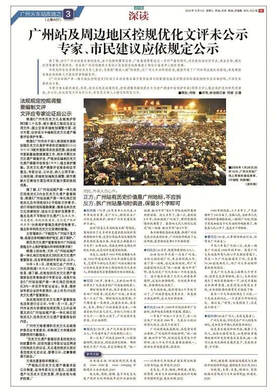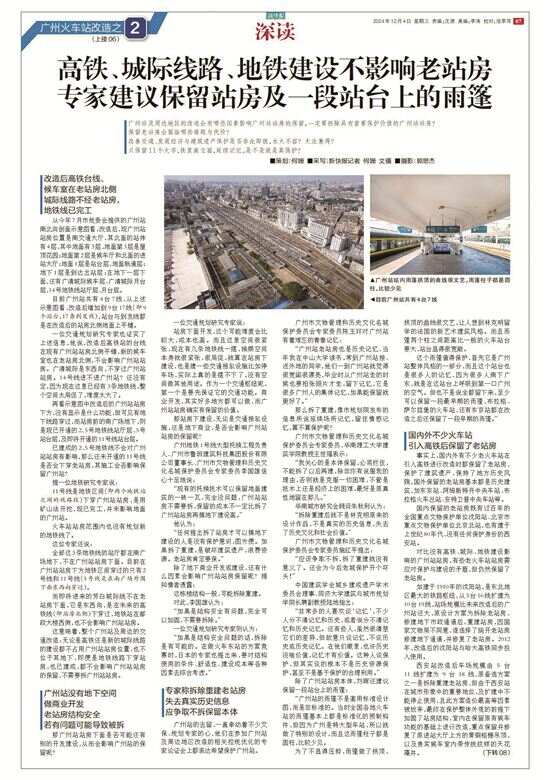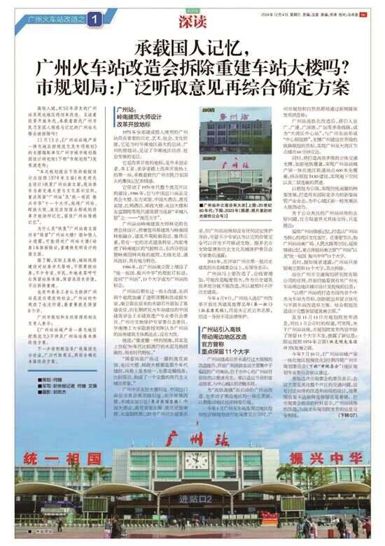 《广州火车站改造系列报道》创作始末 《新快报》“深读”栏目的许多重大公共事件、公共决策深度报道都是持续十几年跟踪、专业调研积累的成果,并影响了公共决策。 《广州火车站改造系列报道》的采访始于十三年前,2013年广州认定首批历史建筑时,记者从内部获悉:广州火车站站房因高铁改造或被拆除,被剔除出历史建筑推荐名单。此后11年间记者一直关注火车站改造动态。 2024年8月广州火车站地区控规优化获批,规划没有明确其去留,之后记者从规划部门处获悉站房将全拆后重建南立面,但改造方案未定。 公众误以为有重大保护价值的广州站站房将被保留的情况下,独家披露广州站站房将面临全拆的真相;同时也曝光了决定火车站去留的文评报告没有按规定专家论证及公示。 报道回答了保留广州站与高铁及周边改造不矛盾的焦点问题;辨析恢复广州站南立面不是真保护;借鉴国内外火车站的保护范例;表达乘客、市民、文保人士、专家不同群体对车站的情感、记忆和去留的意见;建议文化遗产调查评估进行公示,推动信息公开、公众参与。 报道坚守了真实性、客观性的新闻专业主义原则,信息量大,专业性、说服力强,视野开阔,既有理性辨析又富于情怀与建设性。 报道引起广泛关注,市规划和自然资源局相关领导表示将指导广铁充分论证,听取意见再确定改造方案;不少专家感谢新快报报道呼吁保留站房,寄望媒体发挥作用;市民、读者也踊跃留言表达意见,大部分希望保留站房。 有政协委员参考此报道提交了《关于整体保护广州站大楼并公布为历史建筑》的提案。报道入选2024年度“广东好新闻”征集展示活动推荐作品。