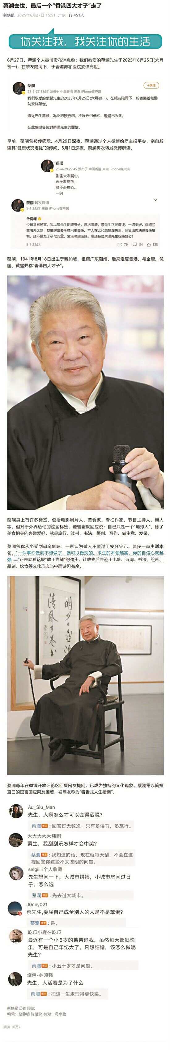 《蔡澜去世,最后一个“香港四大才子”走了》消息背后 2025年6月26日深夜,记者陈斌给值班编辑发来信息:其从饮食界业内人士处得知,蔡澜先生疑似已去世。在那之前,蔡澜已被屡次传出身体抱恙,若离世一事属实,这将是个令人惋惜的新闻!编辑不敢懈怠,一边开始组稿,一边让记者紧盯最新情况。 作为“香港四大才子”之一,蔡澜身上有很多标签:电影制片人、美食家、专栏作家、主持人、商人等,其先后出版过200多部书籍,和李碧华、亦舒并称香港天地图书公司的三大“台柱”,主持的电视节目《蔡澜叹世界》《蔡澜叹名菜》《今夜不设防》等广受欢迎。蔡澜最吸引人的其中一点就是他的睿智豁达——曾连续几年在春节前一个月开放微博评论区,回复网友各种提问,一语中的,时而风趣时而毒舌,被网友亲切地称为“反矫情达人”。蔡澜希望留给后人的印象是什么呢?想必还是他的自在、他的洒脱、他的豁达。思绪至此,编辑迅速整合关于蔡澜的过往报道,并静待进一步的消息。 27日,蔡澜个人微博公布消息:蔡澜先生6月25日已在香港养和医院安详离世。这也意味着,“香港四大才子”均已谢幕。编辑第一时间捕捉到最新消息,加上前期准备充分,迅速在微信公众号发布《蔡澜去世,最后一个“香港四大才子”走了》,同城首发,阅读量将近20万,点赞转发评论数将近1万,网友们纷纷表达不舍:“感恩带给我豁达的人生观与智慧”“记得那年的《今夜不设防》”“潇洒人生,最后的时间里也是那样潇洒”……尤记得蔡澜说过“人生大事,吃喝二字”,真是潇洒自在,舍尔其谁! 新快报新媒体编辑 赵静明
