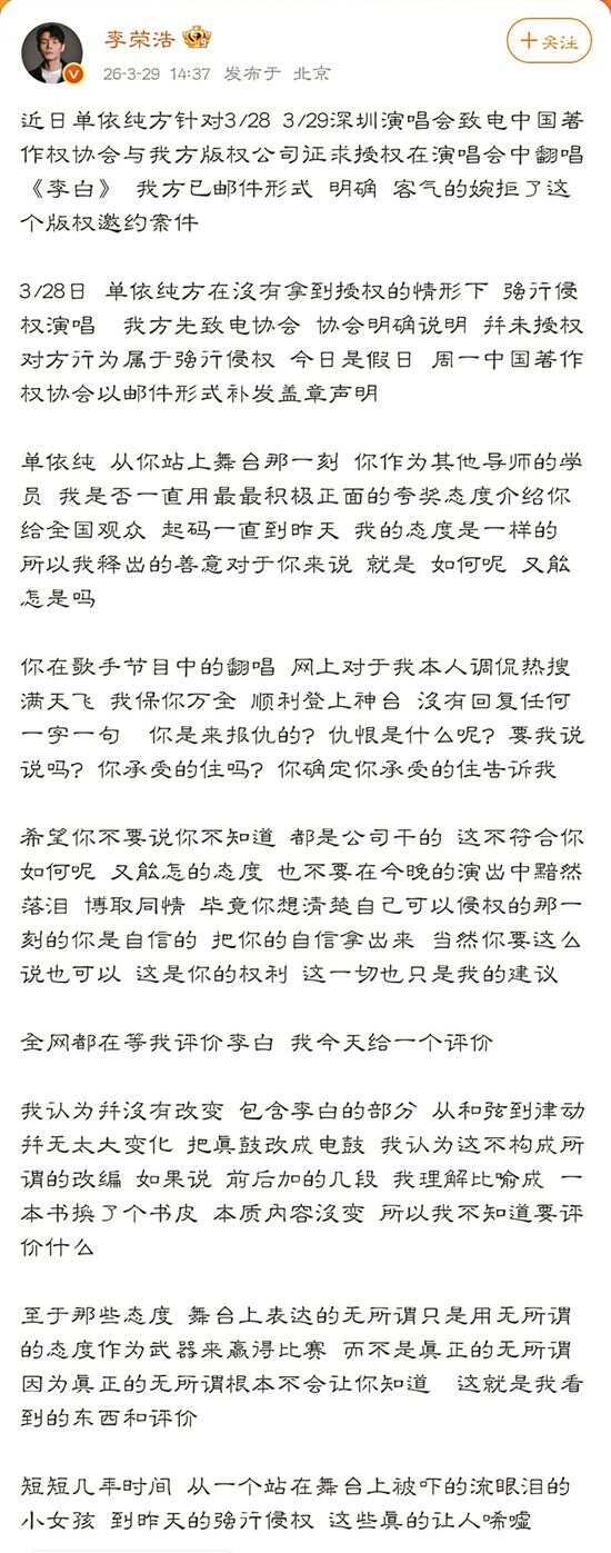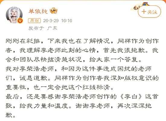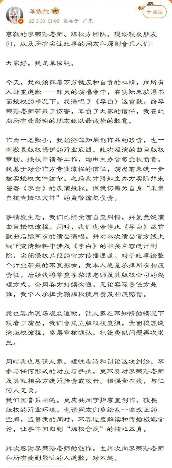 单依纯翻唱《李白》引“强行侵权”争议 近日,歌手单依纯在演唱会上翻唱李荣浩代表作《李白》,引发一场备受关注的版权争议。李荣浩在社交媒体上公开斥责其“强行侵权”,单依纯两度致歉并承诺愿意承担赔偿。随着演唱会市场的持续火热,歌手翻唱一首歌的边界究竟在哪?对此,律师明确指出,“明知未授权还唱”属于故意侵权,歌手难以用“不知情”为由,完全免除或减轻自身法律责任。 ■采写:新快报记者 毛毛雨 事件回顾 李荣浩明确婉拒授权 单依纯致歉愿意承担赔偿 3月29日,歌手单依纯与音乐人李荣浩因演唱会翻唱引发版权争议。李荣浩在社交媒体发文,称单依纯在3月28日的深圳演唱会上,在其团队已明确婉拒授权的情况下,仍“强行侵权”翻唱其作品《李白》。他出示了相关邮件,证实未就此次演出发放授权,并对此行为连续发问。 29日下午,单依纯首次回应并迅速道歉。30日凌晨,单依纯称巡演曲目授权事宜由主办方全权负责,自己因疏忽未亲自核查文件,事后才知主办方实际未签署《李白》的表演授权。她表示愿为自身监督疏忽担责,将停唱该曲、删除相关宣传,并承担全额版权费与赔偿。 30日凌晨,李荣浩再次回应,称自己不需要赔偿,但提及因此遭受网络暴力。他表示若事件不再发酵、不对其本人及家人进行攻击,则“暂且这样”,但会依据舆论保留追究的权利。 焦点1 演唱未获授权歌曲,侵犯了哪些权利? 商演不存在“默认授权” 新快报记者通过汉盛律师事务所高级合伙人李旻了解到,歌手未经授权演唱他人歌曲,核心侵犯原词曲作者的表演权,同时可能涉及多项关联著作权权利。 根据著作权法相关规定,表演权通常包括公开表演作品及以各种手段公开播送作品表演的权利,未经授权的公开演唱、商业演出等行为,一般会涉及此项权利。 此外,还可能涉及获得报酬权,原作者通常享有因作品被使用而获取合理报酬的权利;若对歌曲旋律、歌词等进行修改且未获许可,可能涉及改编权;若存在歪曲作品核心表达的情况,也可能侵犯保护作品完整权;若演唱过程被直播、录播并上传网络,还可能涉及信息网络传播权。 有网友疑惑,“之前演唱会也唱过,这次怎么就不行了?”对此,李旻的解释很明确,商业演出中,每一首翻唱歌曲通常都需要获得单独、明确的授权,一般不存在“批量授权”“默认授权”的情况。 那么,什么时候翻唱不算侵权?著作权法中虽存在“合理使用”无需授权的情形,但需满足严格条件,且通常与商业演出无关,例如个人学习、研究、欣赏时的私密演唱,不对外公开且不营利;完全免费、无商业关联的表演;已进入公共领域的作品;课堂教学、公益研究等合理公益用途。一旦与商业挂钩,无论规模大小、票房多少,都难以援引此条。 焦点2 如果侵权,如何赔偿? 首先根据权利人实际损失酌定赔偿金额 若侵权成立,歌手、演唱会主办方、经纪公司等相关侵权者,首先要承担的通常是民事责任:必须停止侵害、消除影响、公开赔礼道歉、赔偿包括实际损失及合理维权费用在内的损失。 除了民事责任,著作权主管部门还可对侵权方给予警告、没收违法所得、罚款等行政处罚。极少数情节特别严重的,需结合侵权获利、情节严重程度等判断是否涉及刑事责任。 根据著作权法相关规定,歌曲翻唱侵权的赔偿金额,一般按以下顺序考虑:首先是权利人的实际损失,通常可参考涉案歌曲正常商业授权费及侵权演唱场次等因素估算;其次是侵权人的违法所得,即通过侵权演唱获得的相关经济收益。 如果这两项都难以确定,也可以参照同类作品授权标准,或法院结合作品知名度、侵权情节、主观过错等因素,在法定范围内酌定赔偿金额。 根据媒体报道,有业内人士表示,每首歌的版权费计算标准不一样,“如果是通过中国音乐著作权协会,会有一个计算公式。如果是直接找作者或者作者所在的版权公司授权,一般会根据歌曲的流量情况有自己的版权价格,一般几万到几十万元不等,有遇到过单次单首歌3万元左右版权费的情况。” 据中国音乐著作权协会官方网站显示,《使用音乐作品进行表演的著作权许可使用费标准》中规定,音乐会、演唱会等现场表演的收费,按以下公式计算:音乐著作权使用费=座位数×平均票价×4%。标准中,还指出了最低使用费的计算方法,如座位数在1000(含)以下时,每首音乐作品收费低于100元的,按100元计;座位数在50001(含)以上时,每首音乐作品收费低于3000元的,按3000元计。 焦点3 表演者与主办方如何划分责任? 表演者负有核查义务 关于责任划分,主办方一般是授权核查的首要责任方。歌手本人的责任轻重需结合主观过错程度认定。 微博博文显示,李荣浩主张“强行侵权”,意思是歌手明确知晓未获授权的情况下仍进行演唱,这与因疏忽“以为获得授权”或“忘记申请”相比,承担的责任有何不同?李旻表示,两者核心区别在于主观过错程度不同,对应的责任承担和处置力度也因此有轻重之分。具体需结合案件实际情况认定。 如果是“明知没授权还唱”,属于故意侵权,主观恶意相对较大。一旦被认定,歌手大概率需要与主办方承担连带责任,且很难减轻责任。在赔偿和处罚上,也可能面临更严格的处理,包括可能适用惩罚性赔偿等。 如果是“因疏忽误以为有授权”,则属于过失侵权,主观上并无侵权故意,只是未尽到合理注意义务。其过错程度