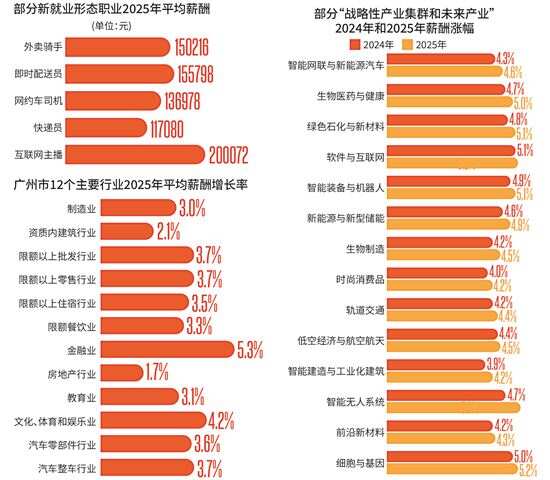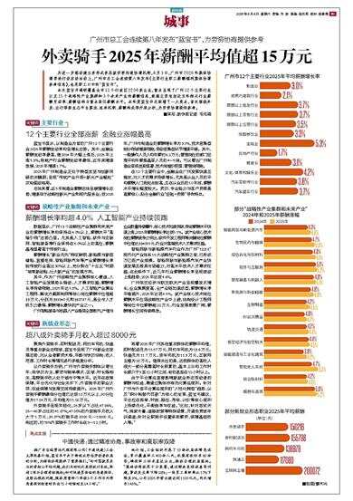 广州市总工会连续第八年发布“蓝宝书”,为劳资协商提供参考 为进一步推动建立多形式多层级劳资沟通协商机制,4月3日,广州市2026年集体协商要约行动启动活动上,广州市总工会连续第八年发布《主要行业职工薪酬福利集体协商参考信息》,也是职工口中的“蓝宝书”。 本次蓝宝书调研覆盖全市11个行政区2204家企业,重点呈现了广州12个主要行业以及15个战略性产业集群和3个未来产业的薪酬信息,数据主要包括近五年相关行业薪酬变动率、薪酬结构与重点岗位薪酬水平。本年度蓝宝书还新增了一大亮点,首次围绕外卖、出行等新业态平台算法、派单机制、薪酬构成等开展分析,为劳资协商提供参考。 关键词 主要行业 12个主要行业全部涨薪 金融业涨幅最高 蓝宝书显示,以制造业为首的广州12个主要行业2025年薪酬变动率均呈增长态势。其中,金融业薪酬变动率最高,继2024年大幅上涨后,2025年上涨5.3%;房地产行业薪酬变动率最低,近年来增速放缓,2025年增速1.7%。 2025年广州制造业正处于转型攻坚与创新突破的关键期,呈现“传统产业升级+新兴产业崛起”双轮驱动格局。 总体来看,近5年制造业薪酬总体呈缓慢增长态势,增速低于战略性新兴产业和现代服务业;到2025年,广州市制造业的薪酬增长率为3.0%,技术密集型细分领域增速领跑,劳动密集型环节增速平缓。其中,一般操作人员人均年薪约6.2万元;管理岗位的部门经理平均年薪是基层人员的4—5倍。可以看出广州制造业层级差距显著、技术岗溢价明显、管理岗领跑。 在12个主要行业中,金融业在广州发展快速且稳定,对人才的需求持续增长,尤其是从业人员的平均薪酬入门级起点较高,且在从业后的10年间,薪酬水平增长幅度较大。资历、专业能力与客户资源是高薪核心,贴合金融行业“经验+资源”导向特点。 关键词 战略性产业集群和未来产业 薪酬增长率均超4.0% 人工智能产业持续领跑 数据显示,广州18个战略性产业集群和未来产业的薪酬增长率均保持在4.0%以上,薪酬水平“高端引领”态势凸显。尤其是人工智能、软件与互联网、智能装备等行业保持在5.0%以上的高位,薪酬基准显著高于传统行业。 薪酬增长“新业优先”特征鲜明,新能源与新型储能、直播电商、智能网联汽车等产业薪酬增长率较传统行业高出30%以上,充分契合“十五五”时期“培育新动能、壮大新产业”的发展方向。 其中,作为广州战略性产业集群核心赛道,人工智能产业发展势头强劲、人才需求旺盛,薪酬增长率持续领跑,2025年达5.3%。人工智能产业算法工程师、解决方案架构师等核心岗位薪酬中位值超33万元,分别为339340元和332737元,是全市人才吸引力最强、薪酬增长最快的产业之一。 广州智能装备与机器人产业稳居全国前列,产值与企业数量持续攀升,核心技术加速突破,带动薪酬水平快速上涨,2025年薪酬增长率达到5.1%。该产业核心技术岗位薪酬竞争力突出,软件开发工程师等关键岗位薪酬中位值达334055元,行业对高端技术人才需求旺盛。 智能网联与新能源汽车行业作为广州“12218”现代化产业体系15大战略性产业集群之首,已形成万亿级产业规模。智能网联与新能源汽车产业快速发展且极具市场潜力,对高水平技术人才需求旺盛,在此条件下,近几年行业薪酬增长率呈现波动上涨趋势,2025年达到4.6%。 广州低空经济与航空航天产业呈现爆发式增长,企业集聚度高、全产业链加速成型,薪酬增长率平稳提升,2025年达到4.5%。该产业核心技术岗位薪酬水平位居战略性产业中上游,结构设计工程师等岗位中位薪酬超22万元,行业发展前景广阔,薪酬增长空间持续释放。 关键词 新就业形态 超八成外卖骑手月收入超过8000元 聚焦外卖骑手、即时配送员、网约车司机、快递员等重点新业态领域,蓝宝书呈现了广州新业态发展态势,对从业者薪资水准、年龄与学历结构、收入范围、工作时长等情况进行多维度分析。 以外卖骑手为例,广州市外卖骑手群体以青壮年、低学历为主,薪资与跑单模式、区域、时长强相关,高频骑手收入处于城市中等水平。近年在政策保障、平台优化与社会关怀下,外卖骑手的职业认同、权益保障与发展空间持续提升。2025年广州外卖骑手薪酬最低分位值已达到10万元以上,90分位值为17.84万元,平均值为15.02万元。 外卖骑手呈现年轻化,25岁以下占比47.96%,25—40岁占比约41.87%;47.05%的外卖骑手月收入大于1万元,35.97%的骑手在8000元—10000元。相应的,约76%外卖骑手工作时长在9—12小时。 再看2025年广州其他重点群体的薪酬平均值,即时配送员为15.57万元,网约车司机为13.6万元,快递员为11.7万元,货车司机为11.3万元,互联网主播为20万元。值得关注的是,这类群体的高收入很大一部分是靠高时长积累的,基本上日均工作时长都介于9至12小时之间,有的甚至在12小时以上。 由于平台算法直接影响新就业形态劳动者的薪酬与权益,需通过集体协商优化算法规则。针对广州市外卖平台算法规则的“人性化转型”趋势,以及“积分制替代罚款”为核心的变革,蓝宝书建议,平台应在派单、时效、路径、考核、计价等核心规则上持续优化,平衡效率与权益。“比如,针对恶劣天气、商家卡餐、道路封禁等特殊场景,开通免责或申诉通道;针对全职骑手设置保底薪资,保障基础收入等。” 亮点实践 中通快递:通过精准协商,事故率和离职率双降 据广东吉瑞