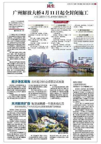 计划工期约6个月,参考绕行路线公布 记者从广州交投集团获悉,为保障桥梁运行安全,广州解放大桥将于4月11日0时起实施全封闭维修施工,计划工期约6个月。 广州解放大桥1998年建成通车
