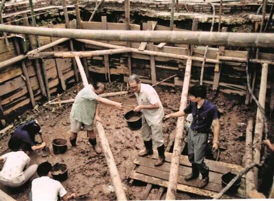■1994年麦英豪(中间白色衣服)在南越国宫暑遗址现场工作(考古)。 |