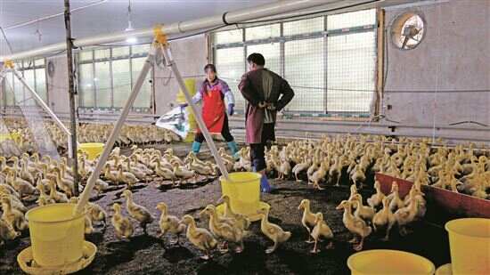 ■工人在鼓扬镇樱桃谷鸭养殖大棚里忙碌着。 |
