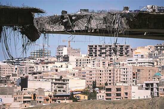 ■遭袭受损的伊朗卡拉季市贝伊克公路桥。 新华社发 |