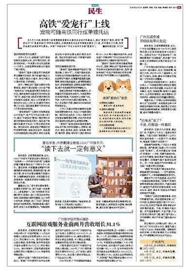自4月8日起,铁路部门在前期高铁宠物托运服务成功试行的基础上,推出“爱宠行”服务,提供“携宠出行”与“爱宠单独行”两种托运模式,办理宠物托运业务的高铁站增至121座、列车增至228趟,将更好地满