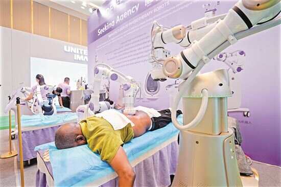 ■第138届广交会第三期,境外采购商体验理疗机器人。(资料图) 新快报记者 郭思杰/摄 |