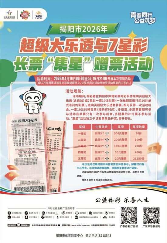 新快报讯 记者陆妍思 通讯员揭阳体彩报道 为感谢广大购彩者长期以来对体育彩票事业的支持与厚爱,进一步丰富购彩体验,揭阳市体育彩票中心将于2026年4月16日正式启动超级大乐透和7星彩长票“集星”赠票活动。本次活动总赠票金额达50万元,先到先得,送完即止,为揭阳购彩者送上春日专属幸运好礼。 活动期间,购彩者在揭阳市体彩实体店购买超级大乐透(含追加)或7星彩一票10注彩票(一张单期票面打印10注单式号码的彩票),或购买超级大乐透套餐票,即可获得一次活动机会。一票10注的预售票(按购买时间)、多倍票、多期票首期可参与活动且单票只有一次参与机会。多期票的补打票不参与活动。“集星”活动独立于该彩票单独开奖,即开即兑。 活动共设置五个奖级,长票票面营销区共打印8个图形,出现5个“乐小星”标志即中得本次“集星”活动一等奖,可获500元赠票;出现4个“乐小星”标志即中得本次“集星”活动二等奖,可获200元赠票;出现3个“乐小星”标志即中得本次“集星”活动三等奖,可获100元赠票;出现2个“乐小星”标志即中得本次“集星”活动四等奖,可获50元赠票;出现1个“乐小星”标志即中得本次“集星”活动五等奖,可获20元赠票。 赠票需在活动实施期内于揭阳市体育彩票实体店进行兑付,赠票不得兑换竞猜型游戏,兑奖时间为活动起至活动结束后三天内,逾期当弃奖处理。 本次活动从2026年4月16日00:00至5月16日21:00,或50万元赠票派送完毕活动随即终止。兑奖时间为活动开始至活动结束后三天内。揭阳体彩中心有权在法律范围内对活动规则作相应解释。如遇政策调整,将另行通告。