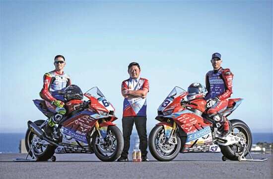 ■“张雪机车”创始人张雪(中)和参加世界超级摩托车锦标赛的车手瓦伦丁·德比斯(右)、费德里科·卡利卡苏洛合影(2月20日摄)。新华社发 |