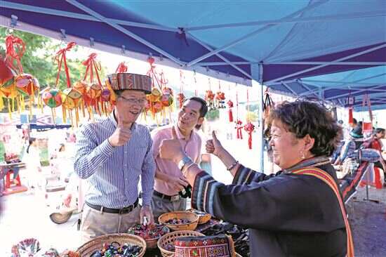 ■在农特产品美食街,驻小三江镇工作队与摊主交流。 |
