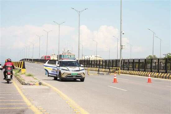 ■4月19日,在巴基斯坦首都伊斯兰堡,警察在一处布有路障的路口执勤。 新华社发 |