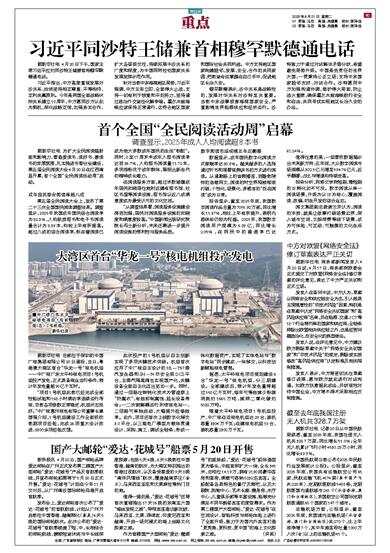 据新华社电 总部位于深圳的中国广核集团有限公司20日通报,当日,粤港澳大湾区首台“华龙一号”核电机组——中广核广东太平岭核电项目1号机组投产发电,正式具备商业运行条件,预计年发电量超90亿千瓦时
