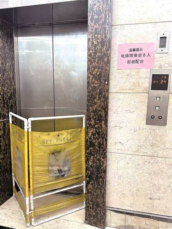 ■近日,记者走访现场时看到A1栋电梯门口已调整限载人数为8人。 新快报记者 金瑜/摄 |