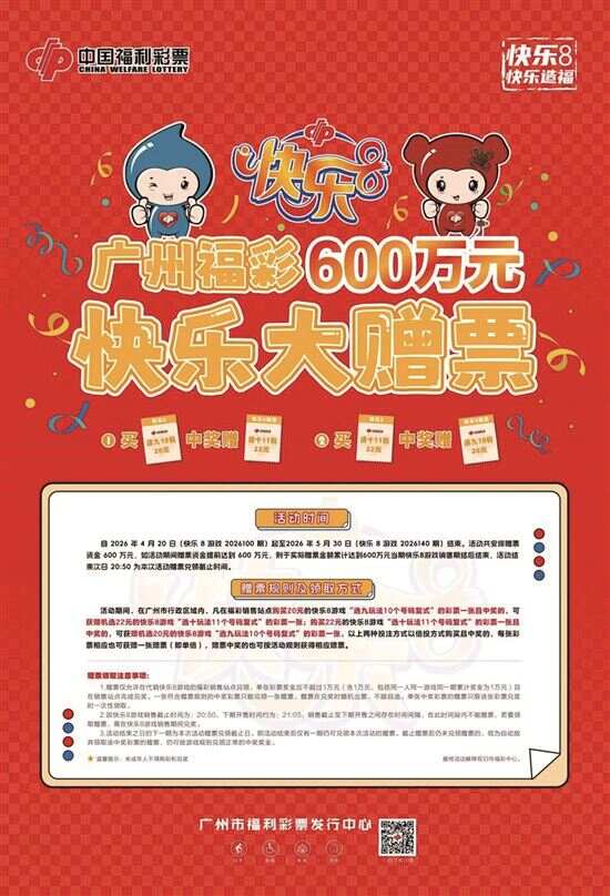 为真情回馈广大购彩者,广州福彩决定自2026年4月20日起,在全市范围内开展“快乐8”游戏快乐大赠票促销活动。本次活动共安排赠票资金600万元。 ■新快报记者 陆妍思 通讯员 穗福彩 两种复式玩法可参与赠票 本次活动将于2026年4月20日(快乐8游戏2026100期)正式启动,对“选九玩法10个号码复式”和“选十玩法11个号码复式”两种玩法开展赠票。 活动期间,凡在广州市福彩销售场所内购买20元的快乐8游戏“选九玩法10个号码复式”彩票且中奖的,可获赠机选22元的快乐8游戏“选十玩法11个号码复式”的彩票一张;购买22元的快乐8游戏“选十玩法11个号码复式”彩票且中奖的,可获赠机选20元的快乐8游戏“选九玩法10个号码复式”的彩票一张,以上两种投注方式以倍投方式购买且中奖的,每张彩票相应也可获赠一张赠票(单倍),赠票中奖的也可按活动规则获得相应赠票。 本次共安排赠票资金600万元 要注意的是,赠票仅允许在广州市代销快乐8游戏的福彩销售站点兑领,单张彩票奖金应不超过1万元(含1万元,包括同一人同一游戏同一期累计奖金为1万元)且在销售站点完成兑奖。一张符合赠票规则的中奖彩票只能兑领一张赠票,赠票在兑奖时随机出票,不能自选。单张中奖彩票的赠票只限该张彩票兑奖时一次性领取。 本次活动共安排赠票资金600万元,计划至2026年5月30日(快乐8游戏2026140期)结束,如活动赠票金额累计达到600万元,则在赠票金额用完的当期快乐8游戏期结后结束。活动结束次日20:50为本次活动赠票兑领截止时间,即活动结束后仅有一期仍可兑领本次活动的赠票,截止赠票后仍未兑领赠票的,视为自动放弃领取该中奖彩票的赠票,但仍可按游戏规则兑领正常的中奖奖金。 “快乐8”是一款基诺型彩票游戏,集公益性、娱乐性、趣味性于一体。全国联合销售、全国统一奖池、全国统一开奖。该游戏按当期实际销售额的58%、30%和12%分别计提彩票奖金、彩票公益金和彩票发行费。以购买一张10元的“快乐8”彩票为例,有3元将纳入福彩公益金,主要用于补充社会保障基金、支持教育助教助学、发展残疾人事业、困难群体大病救助、补助城乡医疗救助基金以及扶贫等社会公益事业;重点用于老年人、残疾人、孤儿、留守儿童、困难群众等社会福利事业。其中,中央彩票公益金的60%用于补充全国社保基金,惠及民生。 广州福彩同时提醒,广大购彩者在参与赠票活动时,也要根据自身情况做好购彩预算,理性购彩,量力而行,切勿盲目投注。 快乐8游戏 知识知多D “快乐8”游戏怎么玩? 很简单。从1到80共八十个号码中,任意选择一至十个号码,每一组一个至十个号码的组合,组成一注彩票。快乐8游戏共包括选一、选二、选三、选四、选五、选六、选七、选八、选九、选十,一共十个玩法。根据选择号码个数对应相应的玩法。比如,“选一”,就是从1到80中选择一个号码;“选十”,就是从1到80中选择十个号码。 快乐8游戏有几种投注方式?复式投注怎么玩? 和双色球游戏一样,快乐8游戏包含单式、复式和胆拖三种投注方式。 1.单式投注 “选一”至“选十”单式投注的号码个数分别为一个至十个。投注时从80个号码中选出对应玩法要求的号码个数作为一注彩票。 2.复式投注 所选号码个数超过单式投注的号码个数,可自动组合成多注单式投注号码。“选一”至“选十”玩法均支持复式投注。 以本次活动的两种玩法为例,“选九玩法10个号码复式”是从1—80个号码中,选择10个号码进行选九玩法投注,投注金额20元。如10个号码中有其中4个及以上号码与当期开奖号码相同,或其中9个及以上号码与当期开奖号码全部不同,即为中奖;如10个号码全部与当期开奖号码相同,则单票最高可中奖金250万元(选九中九为浮动奖,实际中奖金额以当期开奖公告为准)。 “选十玩法11个号码复式”即从1—80个号码中,选择11个号码进行选十玩法投注,投注金额22元。如11个号码中有5个及以上号码与当期开奖号码相同,或其中10个及以上号码与当期开奖号码全部不同,即为中奖;如11个号码中有任意10个号码与当期开奖号码相同,即中得快乐8“选十中十”,单注最高奖金可达500万元;如11个号码全部与当期开奖号码相同,则单票最高可中奖金5500万元(选十中十为浮动奖,实际中奖金额以当期开奖公告为准)。 3.胆拖投注 先选取少于单式投注号码个数的号码作为每注都有的胆码,再选取除胆码以外的号码作为拖码,胆码与拖码个数之和必须多于单式投注号码个数,由胆码与拖码的每一种组合按单式投注方式组成多注彩票。“选二”至“选十”玩法支持胆拖投注。