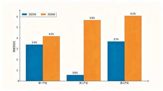 2025年和2026年 广州一季度三大产业增速对比 6.1% 6 5.8% 5 4.2% 3.7% 4 3.4% 3 增速百分比 2 1 0.6% 0 第一产业 第二产业 第三产业 |