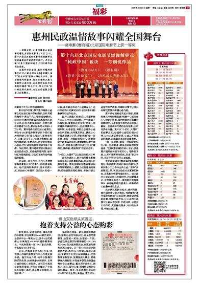 ——微电影《惠有福》北京国际电影节上获一等奖 一部微电影,让惠州福彩公益故事闪耀北京国际电影节!4月23日,第十六届北京国际电影节短视频单元荣誉盛典在河南济源市举行。来自全球30多个国家和