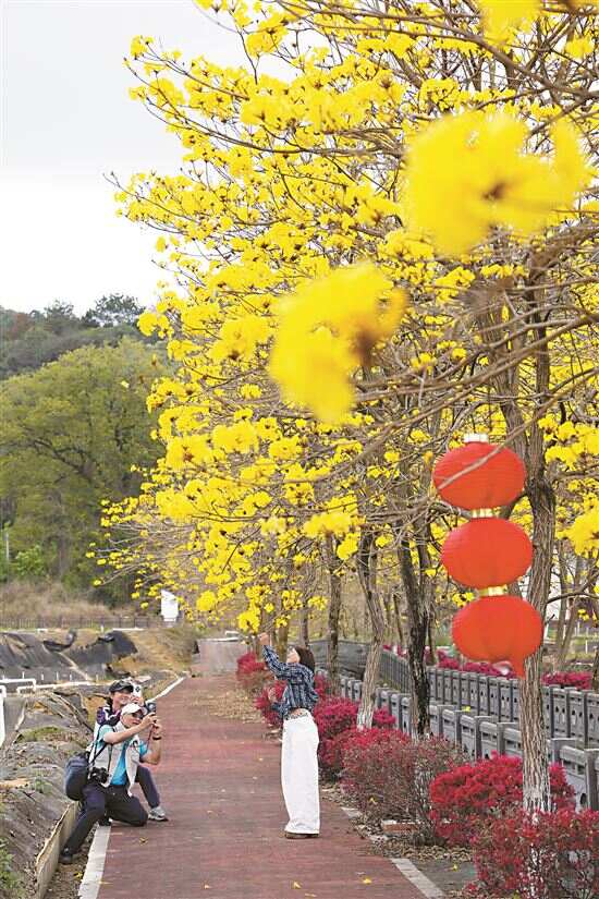 ■游客在松林村的黄花风铃木下拍照打卡。 |