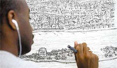 他的专长是城市景观,他曾经乘坐20分钟的直升机飞过纽约市,之后在一张19英寸长的纸上重现了他看到的所有东西。他的图纸非常准确,精确到窗口的数量和位置。