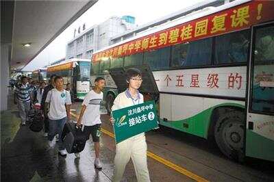 2008年7月1日早晨五点半,汶川桑坪中学第一批600多位师生乘坐的火车专列抵达广州火车站。前来接站的大巴车上贴着的是——“向英勇的汶川人民致敬”,广东碧桂园学校的老师和学生将他们热情地迎上了大巴车队。