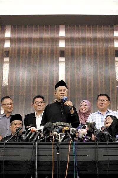 5月10日,在马来西亚必打灵查亚,马哈蒂尔(中)宣誓就任总理后出席新闻发布会。