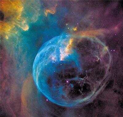 科学家们分析,这个直径在7光年至10光年之间的“大气泡”,应该是一个更大、更复杂的星球及其产生的“气泡”的一部分。这样的“气泡”形态,应该是由一种“狂暴的物理过程”所产生的——在这个气泡星云的右上角有一颗炽热的O型星,它的质量应该是太阳的10倍甚至20倍,也远比太阳更亮。它发散出强烈的恒星风和高能辐射时,就会把周围的分子云内密集的物质吹成泡泡状的结构,并让它发出炫目的光辉。