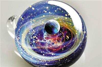 有趣的是,日本一位艺术家Satoshi Tomizu在家中也做出了类似的“星云泡泡”,不过他是用猫眼石与真金碎片,揉进玻璃球中,做出了仿若星云变换的“星云玻璃球”——一个小小的玻璃球中,竟可以看到彩色“星球”的运动轨迹仿佛被凝固住了的画面。艺术家还把这些美轮美奂的玻璃球做成了吊坠,可以随时佩戴在身上。这位艺术家因此获得过一些设计比赛的大奖。