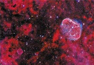 事实上,由于这个气泡星云体积巨大,且就位于仙后座,距离地球约11000光年,我们用小型望远镜都可以观察到它。一位天文学家Eric Mouquet便拍摄到它的长曝光影像,并记录下这个大泡泡周围环境的细微结构,不过这张照片中只看到这个气泡星云的氢原子发出的红光(H-阿尔法辐射)。