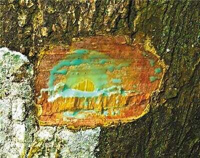 这种树名为“Pycnandra acuminata”,中文名也称“喜树”。它原产于新喀里多尼亚,不过现在随着热带雨林的日渐减少,它的身影也在慢慢消失中。据称目前全世界仅有不到几百棵喜树。喜树的最特别之处,是会流出蓝绿色的汁液——略懂化学知识的人就会立刻想到,这与重金属有关——没错,这种汁液中含有25%的镍。