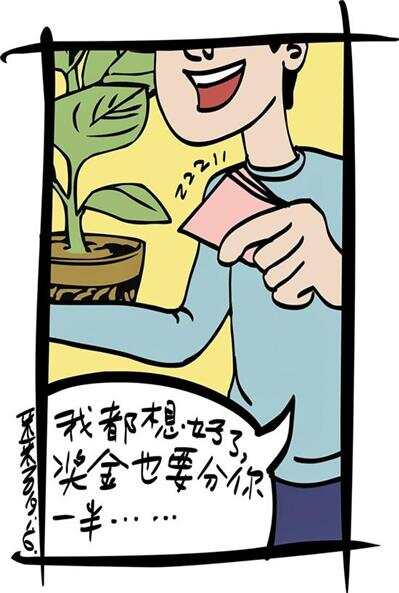 老板想起来了,笑笑说:“那就算了。”尚小发说:“那怎么行,如果不是那两块钱,我也买不了那注彩票,如果买不了那注彩票,我也中不了三等奖。这不,我都想好了,奖金也要分你一半!”说着,尚小发把一半奖金也要塞给蛋糕店老板。