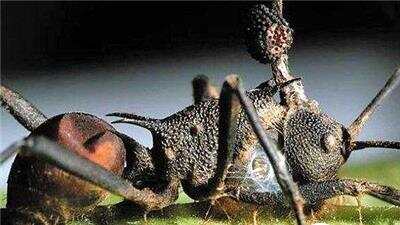 在巴西的热带雨林中,蚂蚁都是集群生活,现代科学家通常将一个蚁群看作一个“超级生物体”,而一只离开蚁群的蚂蚁就如同瞎子和聋子,根本没法独自存活。但有一只蚂蚁偏偏离开了群体,独自爬到一片高高的叶子上,紧紧咬住叶脉,一动不动。它的生命其实已就此终止。不久之后,它的头部会长出芽孢——很明显,这只蚂蚁受到了真菌的感染。