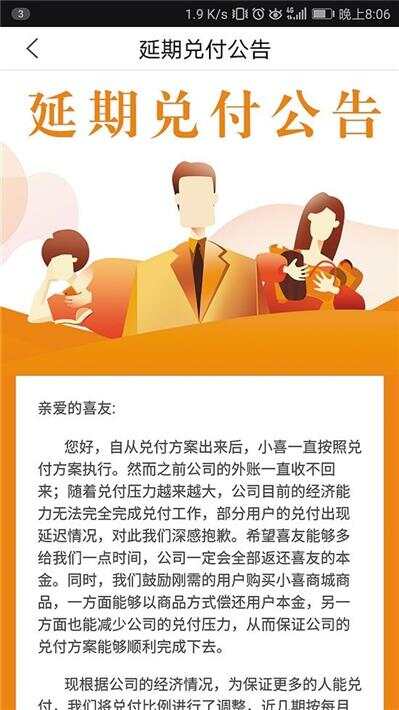 市民吴先生在“车小喜”APP一次性充值8200元,该平台承诺分10个月每个月返还1000元共返10000元的油卡。根据“车小喜”平台上公布的充值规则,用户在平台充值成功后,需到中石化、中石油的直营加油站圈存。吴先生充值后前5个月该平台能正常返还油卡费用,从2018年12月15日开始,“车小喜”APP出现无法充值到油卡、提现无法到账等问题。今年1月18日该公司发布公告称,公司做出退出加油充值行业的决定,承诺不跑路不失联,并承诺分12个月返还用户本金,前4个月每月返还本金的5%,后8个月每月返还10%。3月28日,该平台再次发布延迟兑付公告,将返还比例降为3%,但消费者提现至今未能到账。此外,该平台还在公告中鼓励用户用账户内充值金额购买“车小喜”商城内的白酒、小家电等商品,“减少公司的兑付压力,从而保证公司的兑付方案能够顺利完成下去”。但一位受害者表示,这些商品的价格自兑付出现问题后翻了三倍。