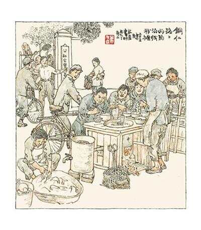 《铜仁路上的肠汤线粉摊》。上世纪五十年代,老上海人早餐喜欢吃肠汤线粉。买一碗二角五分的“全家福”,猪肠、肚、心、肺齐全,再拎只小酒壶配上全家福,就能享受一顿美味而微醺的早餐了。微醺的马路早餐,这在现时的上海几乎看不到了。