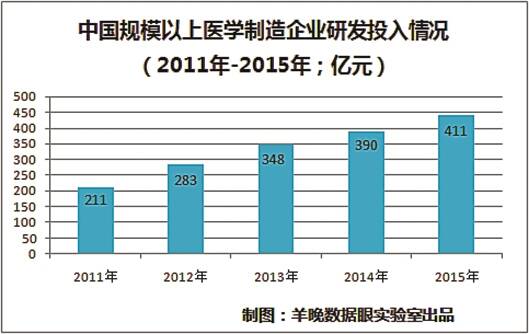 近年国内医药工业研发投入稳步增加。据中国产业信息网的统计,中国医药工业研发投入从2011年的200亿元增加到了2015年的450亿元,复合增速达到20%。