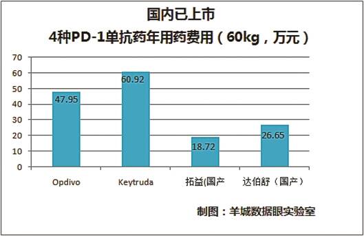 获批时间相差无几,而在价格方面,国产PD-1显然更具性价比优势。如其中,拓益的价格定为7200元/240mg(支)。按照成年人大致50KG—75KG的区间体重范围使用量来说,一年花费大约在18万左右,该价格大约为K药的1/3。