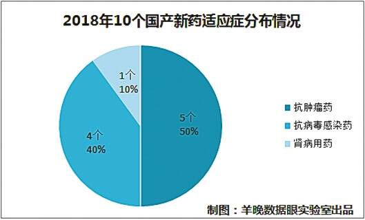从类别上看,肿瘤药仍是新药中占比最高的,其次是感染类疾病和呼吸疾病。记者梳理发现,在这10个国产一类新药中,5个为抗肿瘤药,包括非小细胞肺癌、黑色素瘤、乳腺癌等,4个为抗病毒感染药,包括艾滋病病毒、丙肝乙肝病毒等,还有一个为肾病用药。