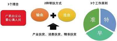 扶贫工作一直是广药集团践行社会责任的重要方面。近年来,广药集团总结国内扶贫几十年之路,改变传统大包大揽的兜底扶贫方式,制定“123”扶贫工作思路,即坚持一个理念——“广药白云山,爱心满人间”,两种帮扶方式——“输血”和“造血”,三个工作原则——“准、早、特”(“准”即精准,是工作方向;“早”即尽早,是时间进度要求;“特”是特色,结合广药集团特色的扶贫模式),要因地制宜地实施精准扶贫、产业扶贫、消费扶贫,真正扶到点上、扶到根上。