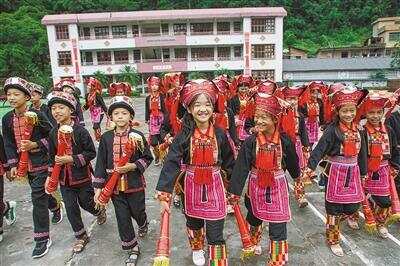6月25日,连山县三水小学的孩子们身穿瑶族服装快乐地跳着长鼓操。作为大山里的孩子能穿上一套漂亮的瑶族服装是多年的愿望,而这个愿望在天河对口帮扶的努力下终于实现了