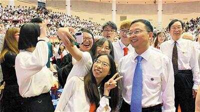 华工毕业生和校长高松玩自拍 张璐瑶摄