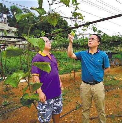 华关(右)深入田间地头查看黄金百香果种植情况