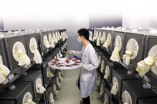 成虫车间内,工作人员给蚊子喂食涂了羊血的血板,以供雌蚊产卵