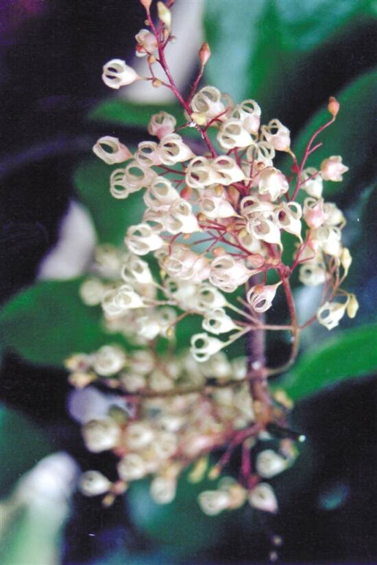 苹婆是种梧桐科常绿乔木,树干通直,株高5米-20米,叶枝繁茂。夏初开花时,圆锥花序顶生或腋生,长达20厘米,着生小花、无花瓣,花萼钟状,长约1厘米,起初为乳白色,后来变为淡红色,花萼5枚裂片在顶端互相结合,形若巧夺天工的“小灯笼”,迎风飘荡,一整片看去又若瀑布飞流直下,十分美丽。花期过后,树上便结出蓇葖果(蓇葖是指果实的一种类型,表现为单室、多籽,成熟时果皮仅一面开裂。常见于毛茛科、木兰科、景天科、梧桐科植物)。果初为绿色,继而变黄色、橙红色,成熟时为鲜红色。果荚呈放射状排列,7-8月时成熟后会开裂,通常每个果里有1-3粒黑色种子,每个直径大约1厘米-3厘米,形状极似亮晶晶的黑眼珠,加上外壳,状如凤眼,故名“凤眼果”。当全树挂满多色的长圆形的蓇葖果,一串串的“黑眼睛”悬挂在碧绿叶海中,整棵树便像是在“睁眼看世界”。