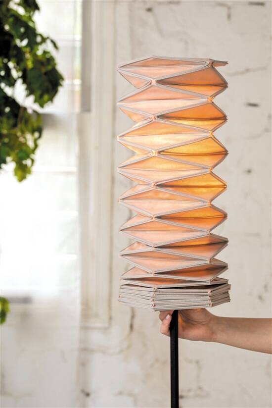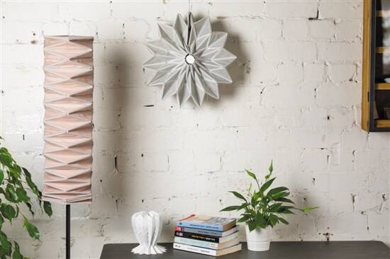 考虑到打印出来的纺织品可能会因为过于柔韧,设计师便将它设计成折纸的造型,用折叠的角度来令造型挺立。而在这个过程中,设计师又发现在拉动灯具表面时,导电材料中的细丝也得到拉伸,并可以起到调节灯光亮度的作用。
