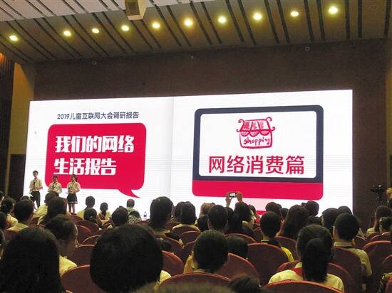 儿童调研员张诗钒、丁绍轩、王雪雯用PPT展示了对网络消费的调查报告,他们很有心地把问卷设计成了儿童版和家长版两种,儿童和家长有效问卷都是313份。