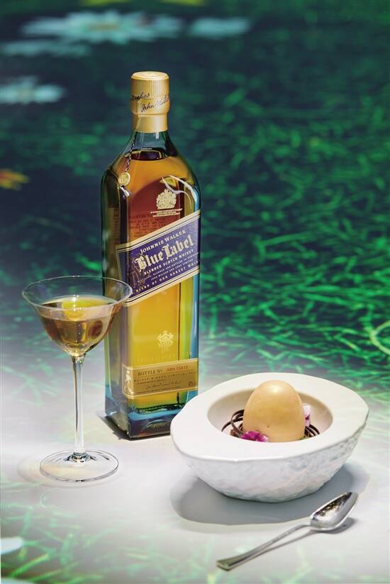 千中选一的白鳟鱼,在菜品“稀世白龙踏彩云”中,以细嫩咸香,引出蓝牌中皮蒂维克酒厂酒液的甜美果香风味;"海珍之冠披翡翠"用新鲜鲍鱼而非干鲍的弹嫩口感,衬托出蓝牌基酒中布朗拉原酒的蜡质感;在“木香双绝佐茶韵”中,蓝牌被盛于茶壶中温热而上,澳洲M9+冠军和牛,被主厨搭配以野生松茸,令蓝牌基酒中波特艾伦的烟熏味萦绕舌尖,诠释味蕾上的平衡之妙。获得张智霖偏爱的甜品,以金鸡蛋造型将越南极品官燕藏于其中,将蓝牌基酒之一坎伯斯中的清甜优雅呈现,为这场中西融合的珍稀晚宴带来悠长余韵。