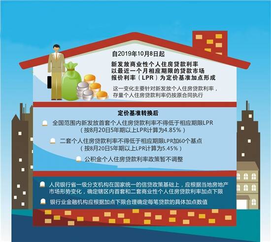 央行公告显示,自2019年10月8日起,新发放商业性个人住房贷款利率以最近一个月相应期限的贷款市场报价利率(LPR)为定价基准加点形成,加点数值应符合全国和当地住房信贷政策要求,体现贷款风险状况,合同期限内固定不变。