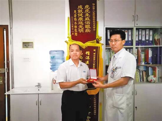 佛山市第二人民医院眼科中心副主任兼眼三科主任段虎成给谢先生颁发纪念章